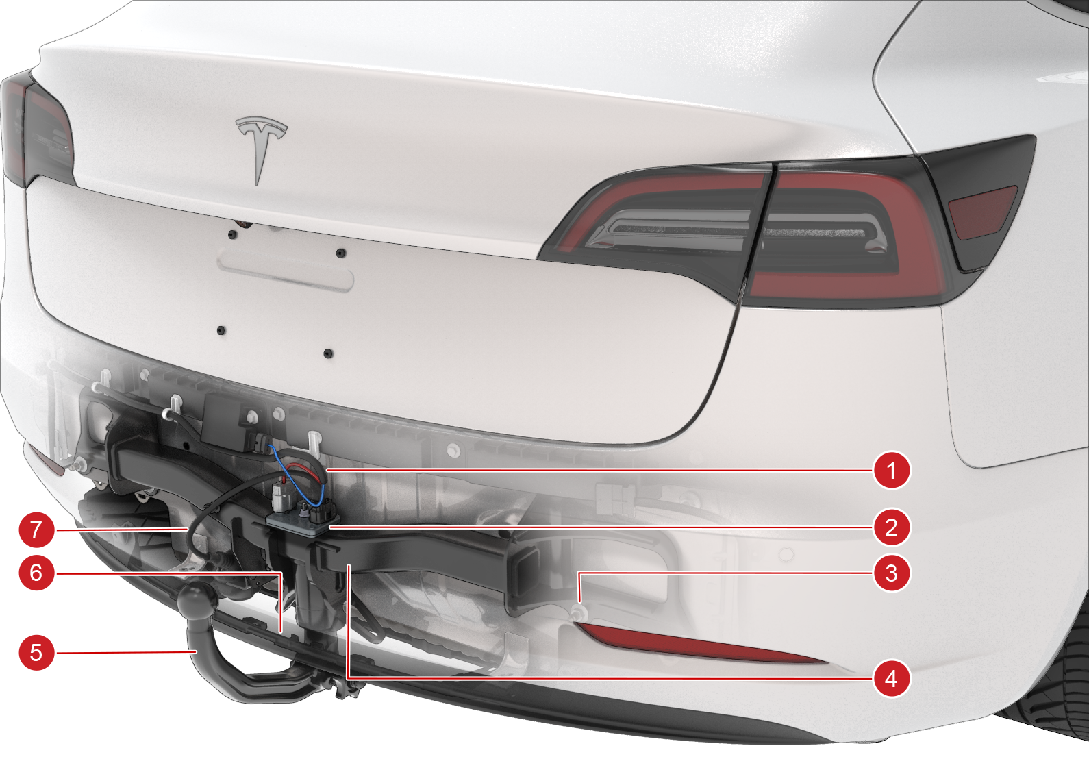 | 1. Vehicle Harness to X041 2. Trailer Light Controller 3. Bolted Connection to Body 4. Tow Bar 5. Detachable Tow Ball 6. Trailer Electrical Connector 7. Vehicle Rear Undertray |