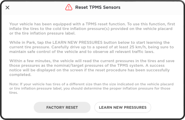 During the "Learn New Pressure", TPMS will read the tire pressure and set this as a new cold tire pressure, overriding the factory specification.