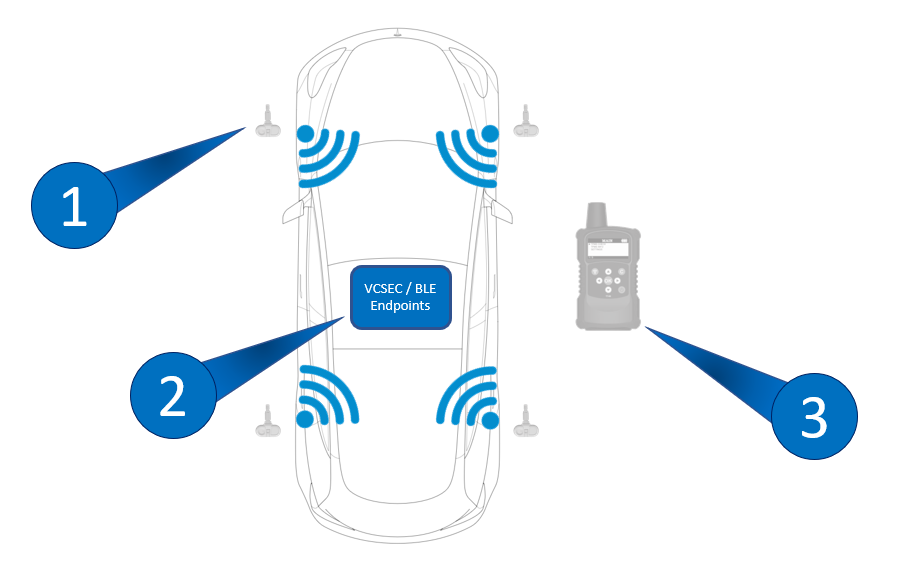 | 1. BLE TPMS Wheel Sensor 2. VCSEC / BLE Endpoints 3. TPMS Service Tool |