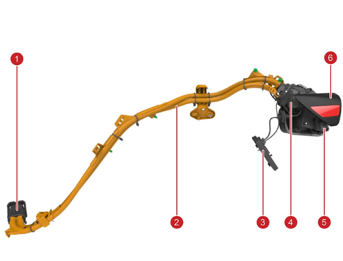 | 1. Lever assisted charge port harness Ancillary Bay connector 2. High voltage charge port harness 3. Charge port ECU 4. Charge port door motor 5. Charge port assembly with door 6. Charge port latch |