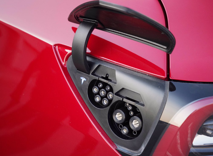 | 1. Door motor (including gears) 2. Charge port trim 3. Trim PCB with hall effect sensor and LED circuit 4. Hall effect location door existence detection 5. Latch stick of AC inlet 6. Chassis ground terminal 7. LED-lit Tesla logo (for charge status indication) 8. Charge port latch motor 9. Latch stick of DC inlet |