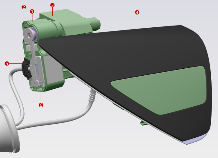 | 1. Door Motor Enclosure 2. Potentiometer and Motor PCBA 3. Charge Port Trim 4. Door 5. Door Drive and Sense Harness 6. Door Motor |