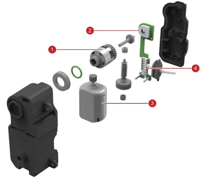 | 1. Door clutch 2. Potentiometer 3. Door motor 4. 5 wire door drive and sense harness |