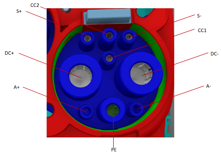 | 1. DC+: Direct Current Positive 2. DC-: Direct Current Negative 3. PE: Grounding 4. S+: Charging Communication CAN_H 5. S-: Charging Communication CAN_L 6. CC1: Charging Connection Confirmation 7. CC2: Charging Connection Confirmation 8. A+: Low Voltage Auxiliary Power Supply Positive 9. A-: Low Voltage Auxiliary Power Supply Negative |