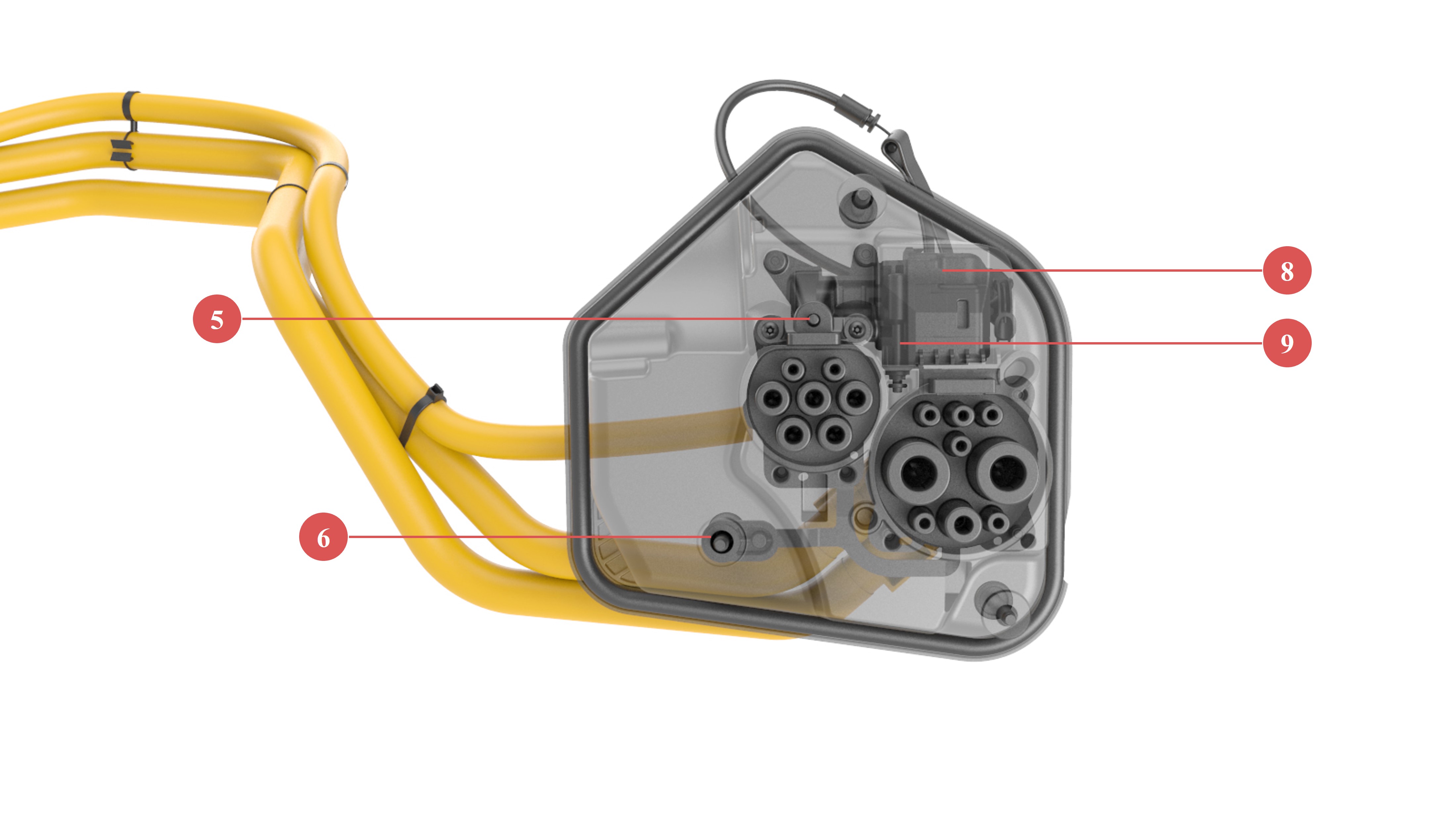 | 1. Charge port latch manual release tab 2. 3 pin latch connector 3. DC inlet signal wire connector (CAN, proximity, ground and thermistor) 4. Bolt connection head of DC busbar 5. High voltage harness for AC charging 6. Latch motor 7. AC inlet signal wire connector (Pilot, proximity, ground and thermistor) 8. 'W' type connector of AC charging harness 9. Chassis ground terminal |