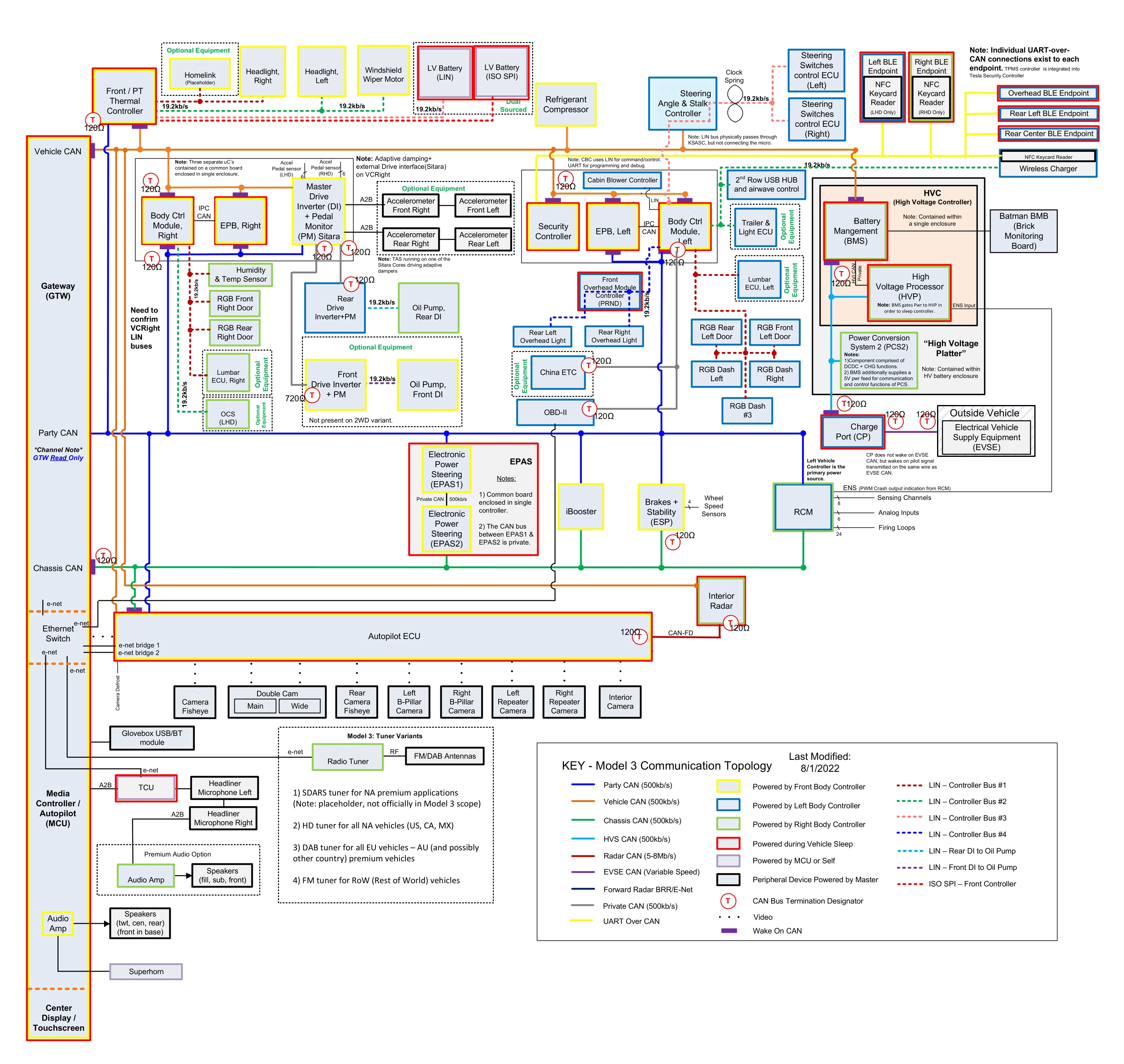 The various controllers on the Model 3 communicate with each other via one of the following: - CAN (Controller Area Network) - Used when high bandwidth, or low latency are required by an ECU. - LIN (Local Interconnect Network) - Used when high bandwidth. or low latency are not required by an ECU. - Video (Coaxial)