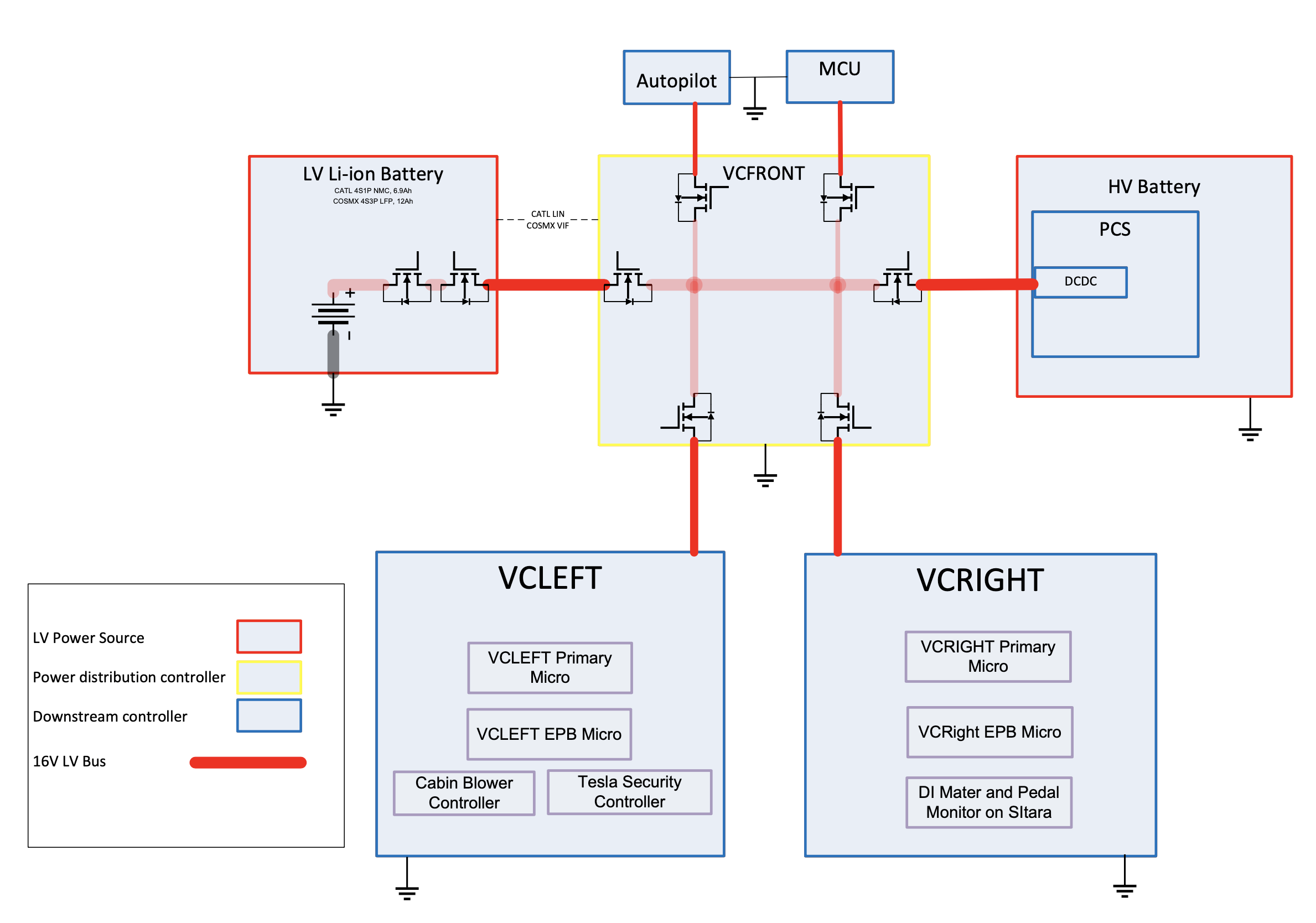 | Sleep Bypass / LV Battery Monitor | VCFRONT | User-Accessible | If a firmware or hardware condition occurs during Sleep resulting in a larger than expected amount of current being drawn, the front vehicle controller microcontroller will wake, attempt to resolve the condition, and put the vehicle back to Sleep. | |