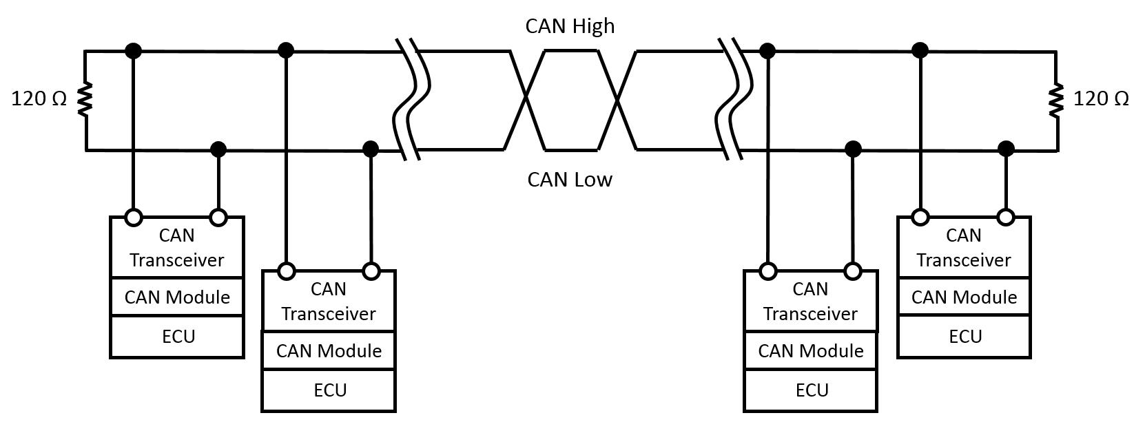 A Controller Area Network (CAN) is a durable low cost communication standard designed to allow any device on the network to communicate with any other device without the need for a host computer. Each Electronic Control Unit (ECU) on a CAN network is connected by 2 signal-carrying wires (CAN-HIGH, CAN-LOW) with each wire carrying a complimentary signal waveform used to signify if the signal being transmitted is a logical 1 or 0.