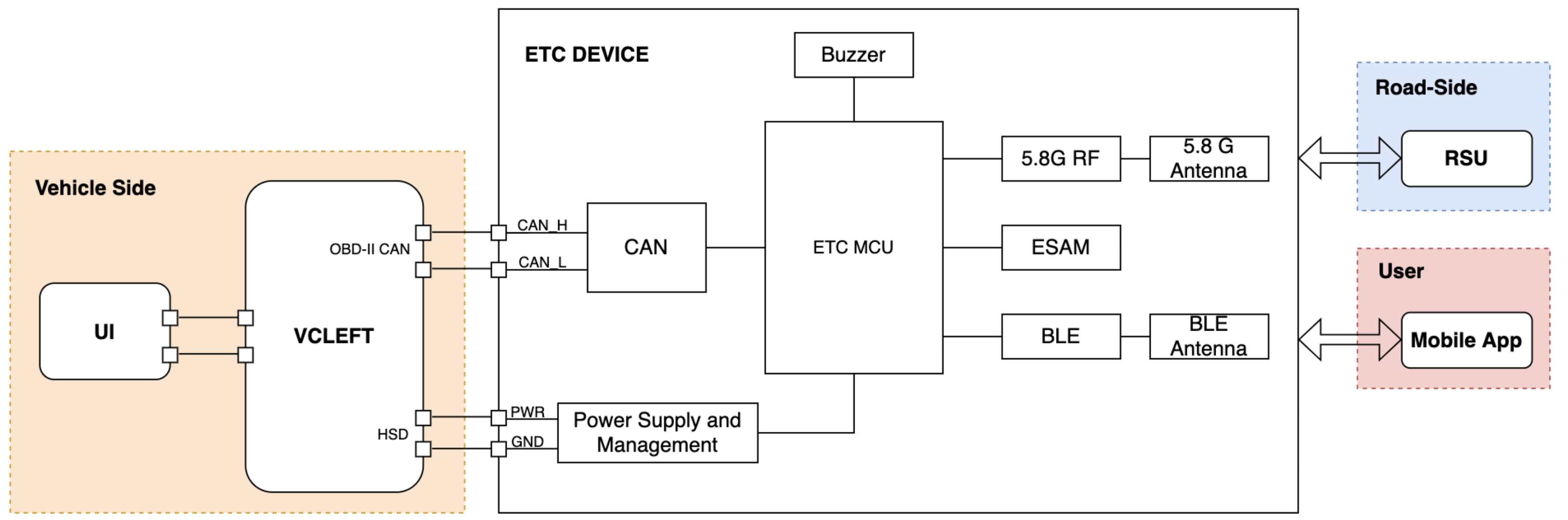 - Electronic toll collector communicates with the left vehicle controller on OBD CAN and gets powered on directly from left vehicle controller high side drive for power supply and management. The left vehicle controller then communicates with the car computer user interface (UI) to display ETC information on the center display.