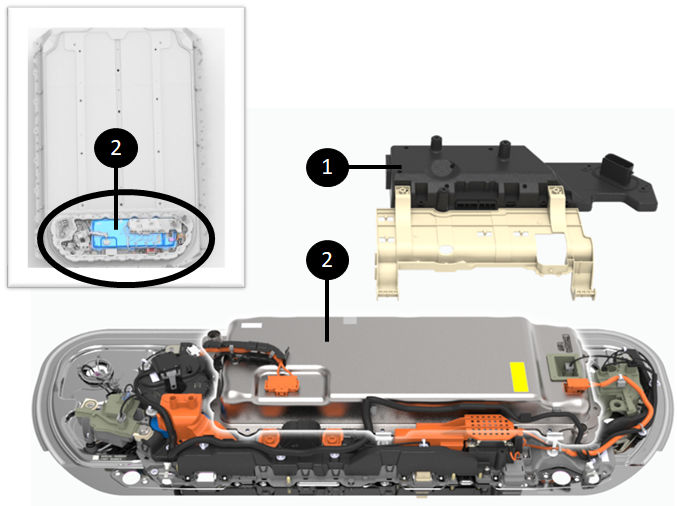 The HV battery devices are located within an accessible section of the HV battery, referred to as the Ancillary Bay, because they are more likely to require servicing when compared to the modules within the platter.