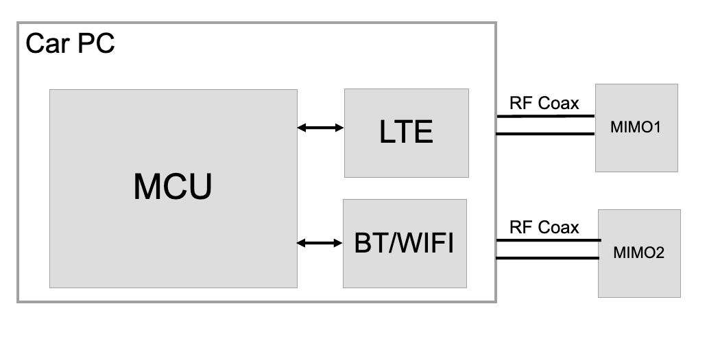 For TCU connectivity architecture, the modem and Wi-Fi / BT are taken out from infotainment mainboard and put into TCU PCBA, along with the MIMO antenna.