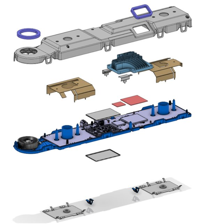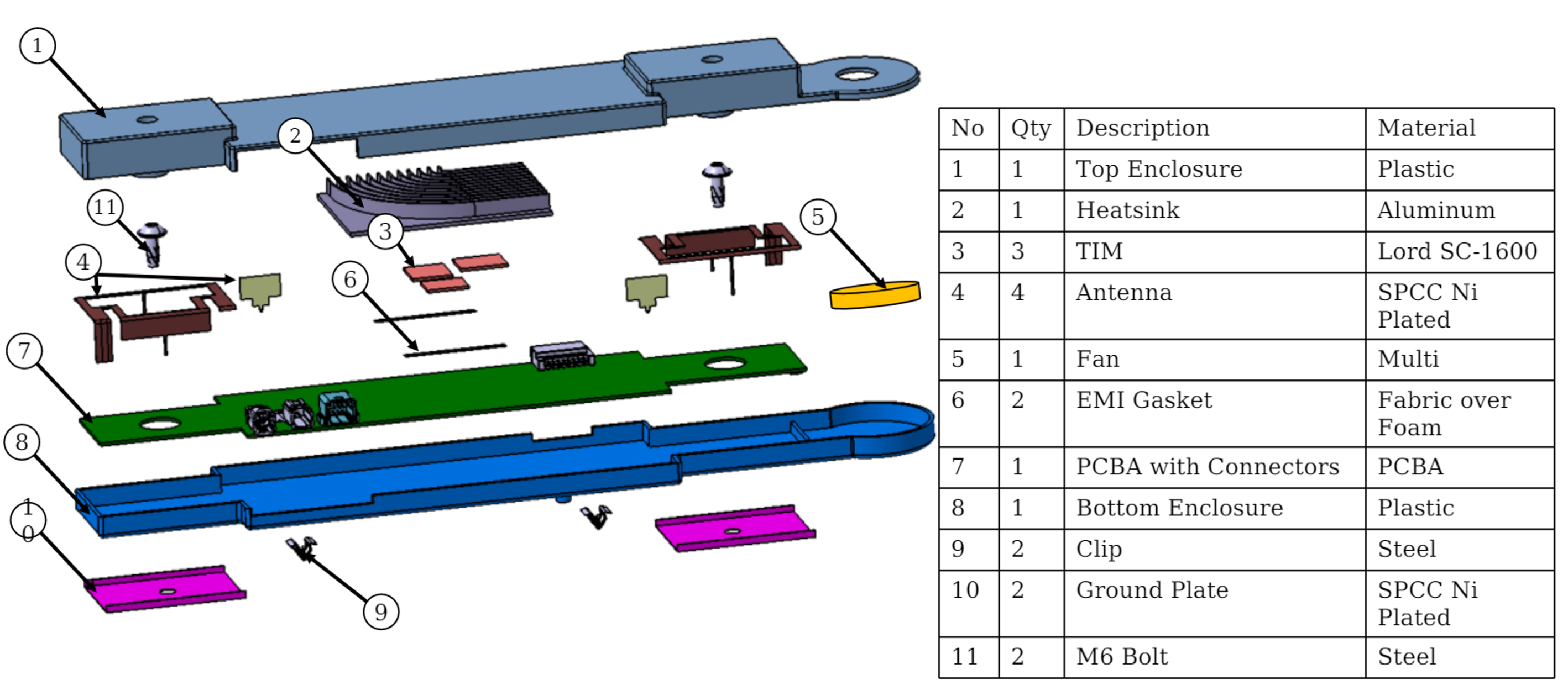 The TCU mainly consists of top and and bottom enclosures, a fan, a cast aluminum heat sink, and a printed circuit board assembly (PCBA).