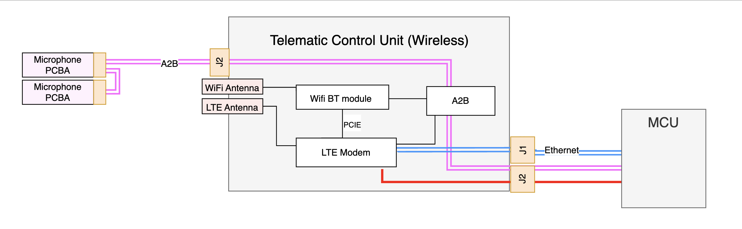 Bluetooth media audio and control signals are sent via ethernet from the TCU to the MCU while Bluetooth telephony call audio is sent via A2B from and to the MCU.