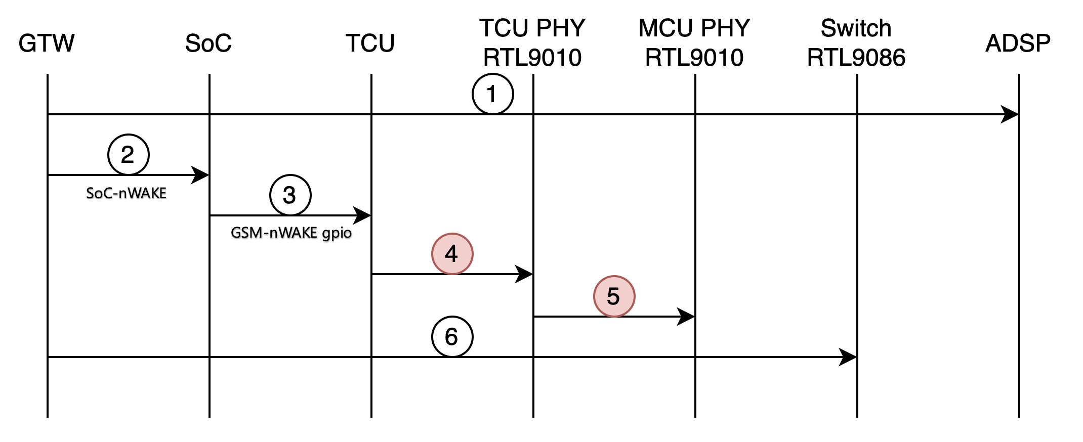 - The TCU asks TCU PHY to wake up via local wake protocol (i.e. toggling the WAKE line of RTL9010 TCU PHY), but the TCU itself does not fully wake up.
