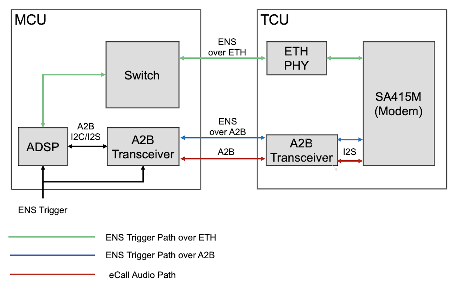 The same Automotive Audio Bus (A2B) transceiver is used in the TCU as the one used in the infotainment board. The A2B module in the TCU is part of the A2B daisy chain. The A2B module in the infotainment board is the A2B primary, and the one in the TCU is the A2B secondary. The upstream of the daisy chain from the TCU is the Audio Digital Signal Processor (ADSP) on infotainment main board and the downstream are the microphones.