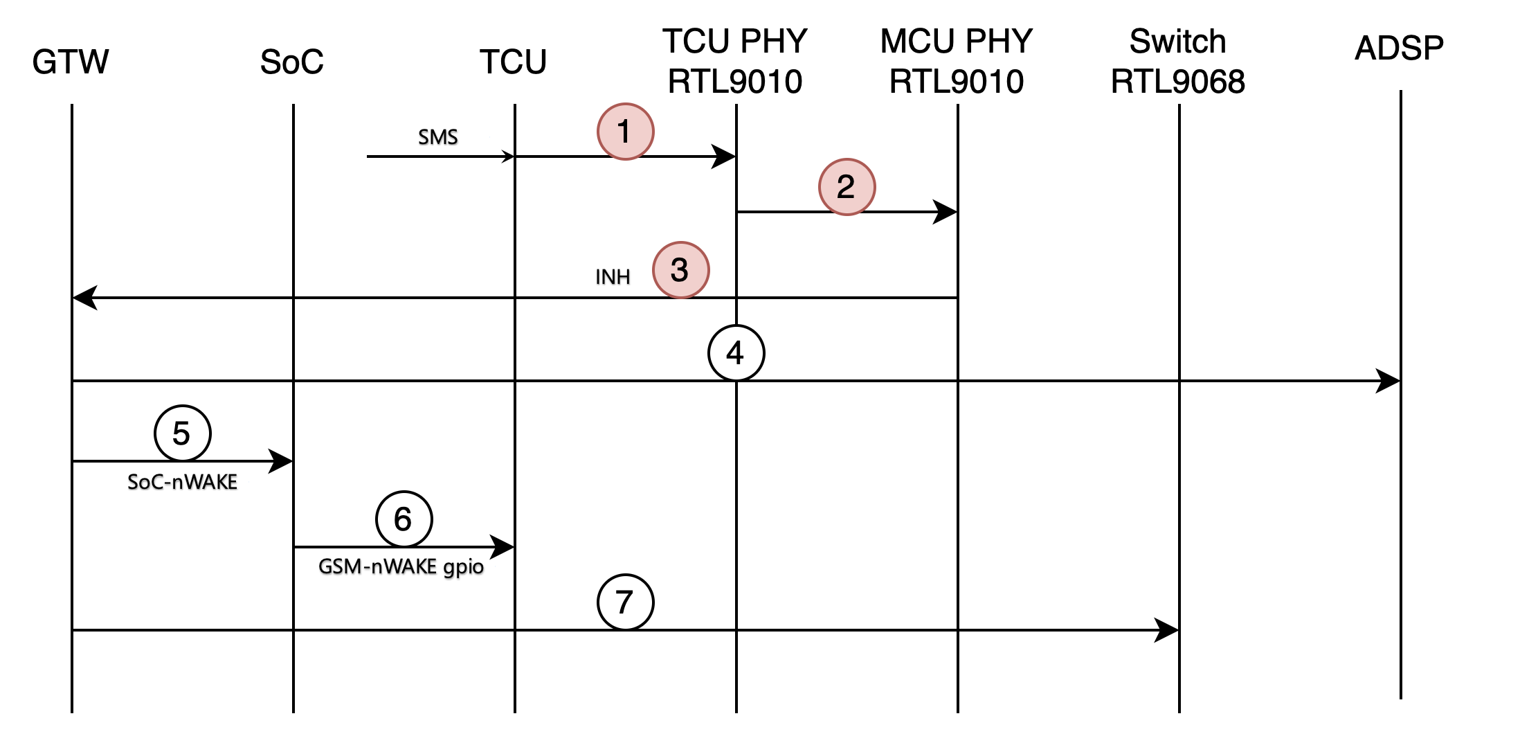 TCU runs in a low power sleep mode when the vehicle infotainment is not in use. The modem within the TCU is connected to the vehicle Gateway (GTW) via ethernet and sends a wake signal when an SMS message is received. The TCU SMS wake sequence is as follows (see image below):