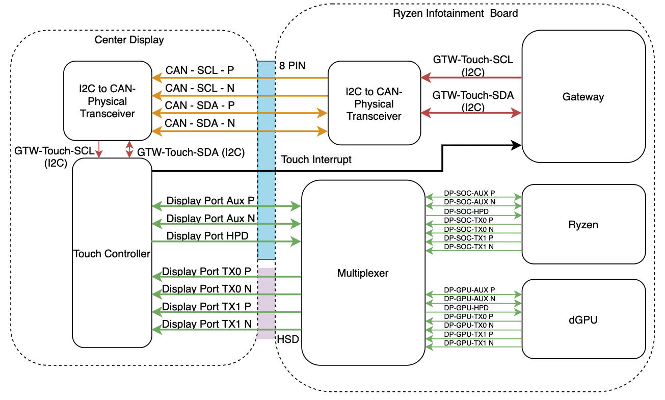 The touchscreen is connected to the car computer via two separate connections. One is a HSD+2 connector carrying display port on the four pins of the HSD and power/ground with the two (+2) additional wires. The second display cable is an 8-pin connector which carries I2C, display port auxiliary, and the touch interrupt line.