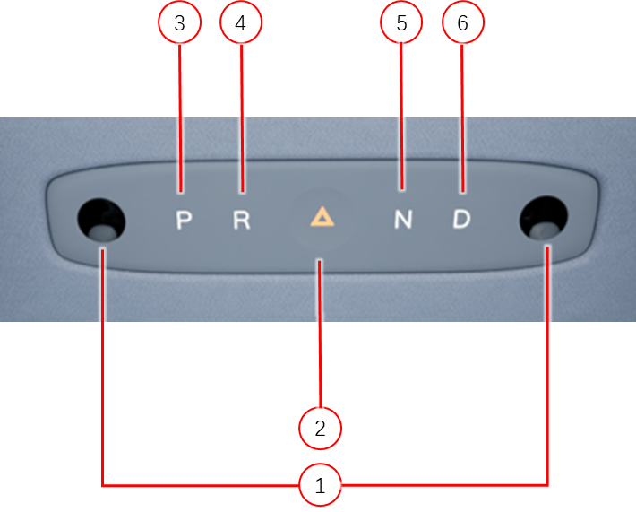 | 1. Map light (x2) 2. Hazard button 3. Park 4. Reverse 5. Neutral 6. Drive |