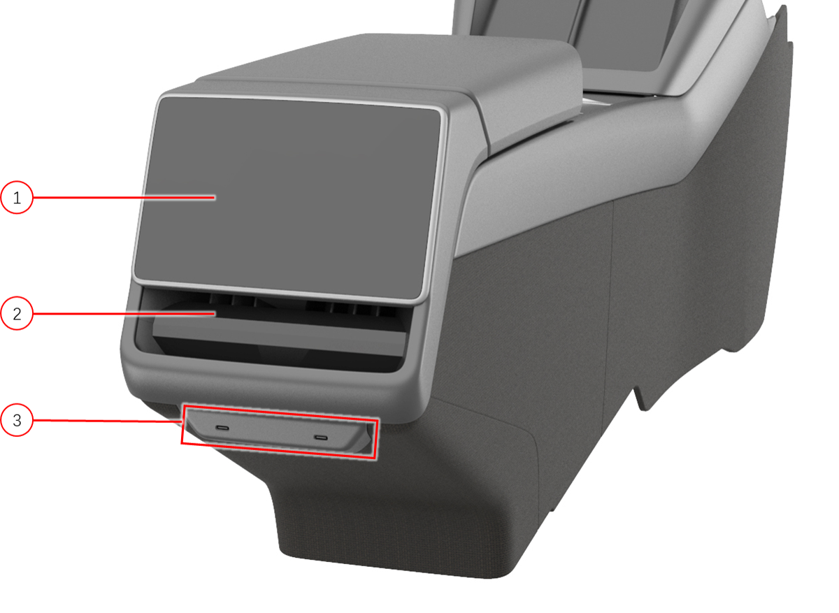 | 1. Rear display screen 2. Rear airwave vent 3. USB-C port (2x, no data) |