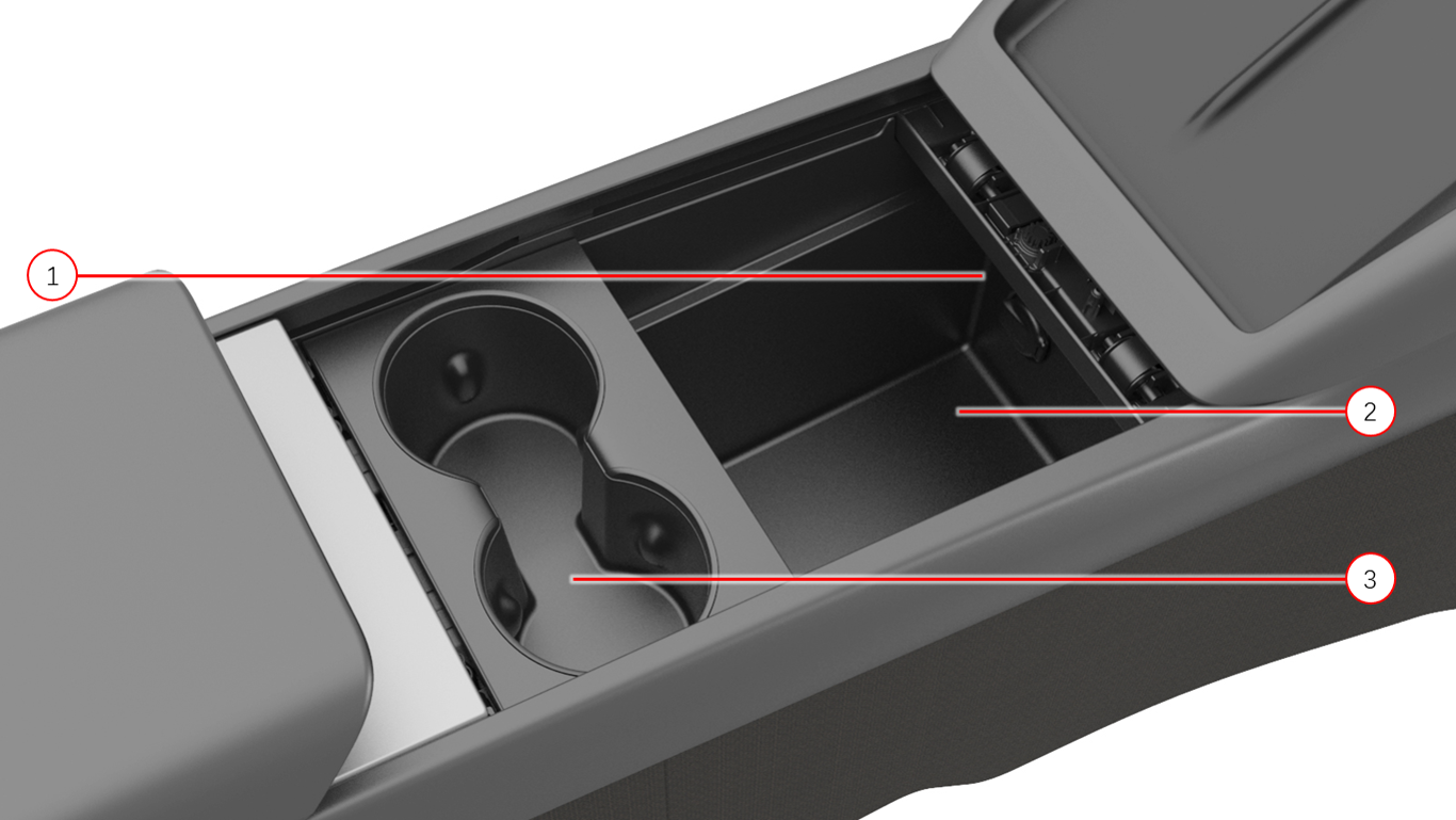 | 1. low voltage socket 2. Front storage bin 3. Cupholder |