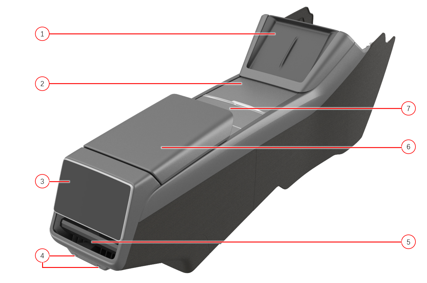 | 1. Phone dock (with NFC for key cards and inductive charger) 2. Cover of the front storage bin 3. Rear display screen 4. USB-C port (2x) 5. Rear airwave vent 6. Armrest 7. Cupholder Cover |