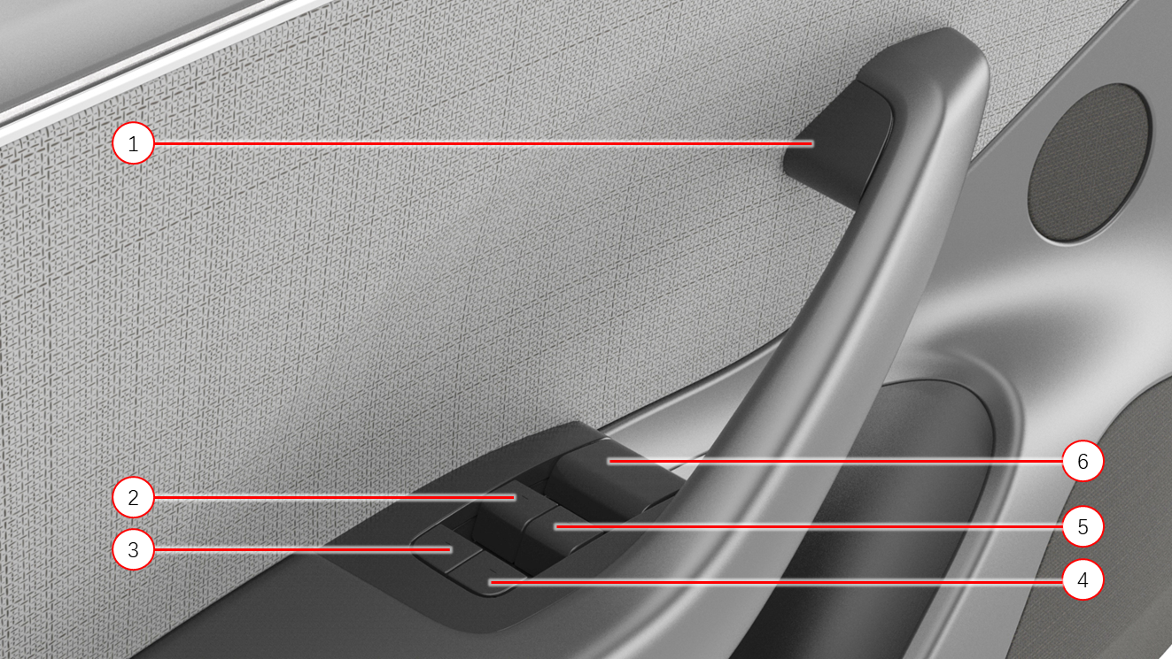 | 1. Electric door release switch 2. Window switch, front left function 3. Window switch, rear left function 4. Window switch, rear right function 5. Window switch, front right function 6. Emergency Door Release Handle (mechanical release lever) |