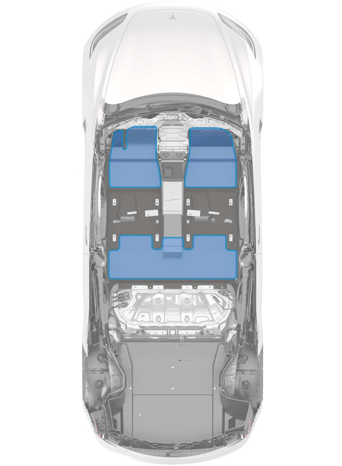 The vehicle has 3 floor mats. The driver's and front passenger's floor mats are separate and the rear floor mat is a wide mat that covers the entire rear passenger footwell. Each mat is cut to fit the shape of the footwell it is designed for, and must be installed with the carpet facing the occupants. A high-retention backing on the mats keep them in position without visible fasteners.