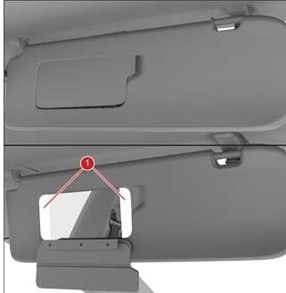 There are 2 sun visors installed to the front of the headliner. Each sun visor has a mirror cover. The mirror cover can be opened and folded down to reveal the mirror and two vanity lights.