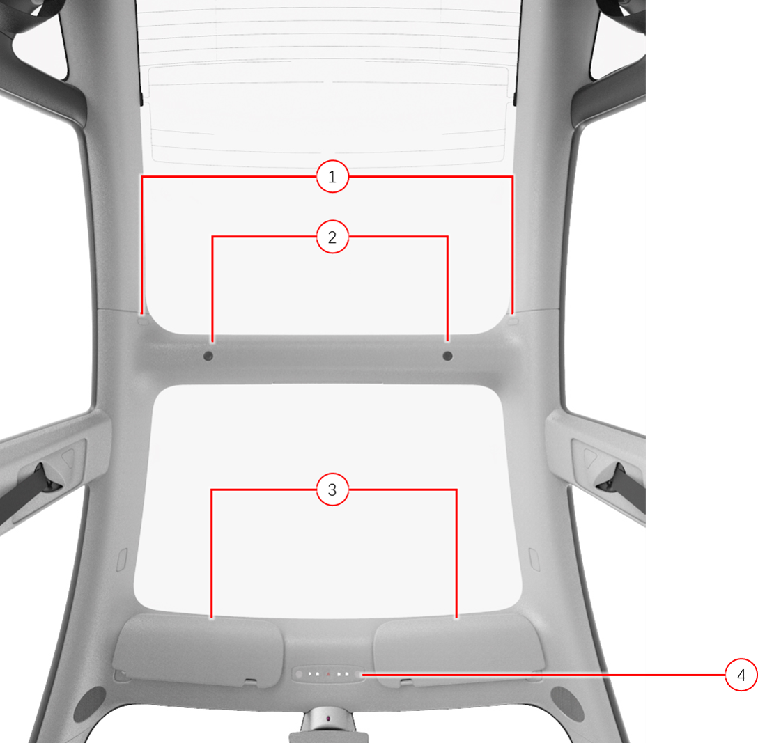 | 1. Coat hook (x2) 2. Second Row map light (x2) 3. Sun visor (x2) 4. Front Overhead Module (FOHM) |