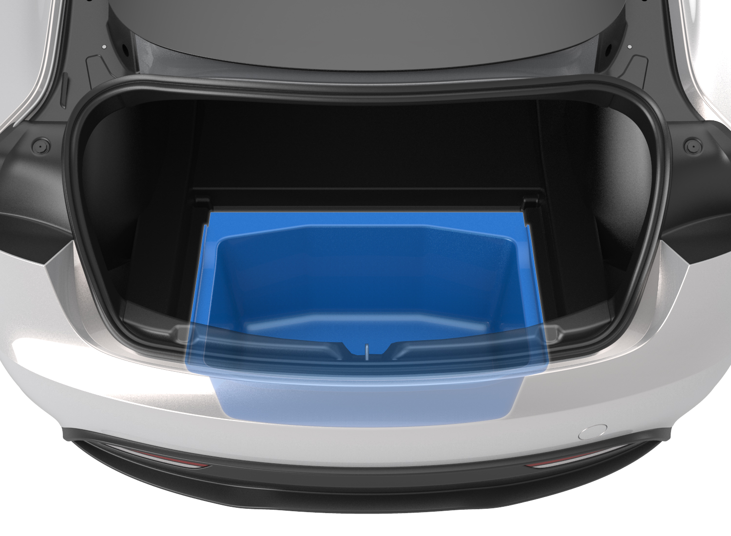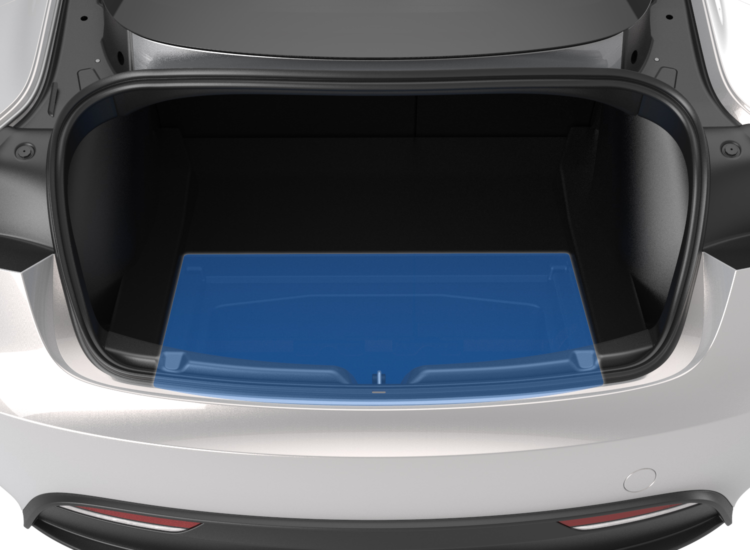 The 2024+ Model 3 has a light-weight load floor wrapped in non-woven carpet and easy lift strap. To access the storage space below, lift the load floor upwards from the strap. The load floor pivots along the rear edge of the trunk trench and it can also be placed at the rear end of the trunk carpet while loading items into the storage. It is recommended to remove all items on the load floor before servicing the vehicle.