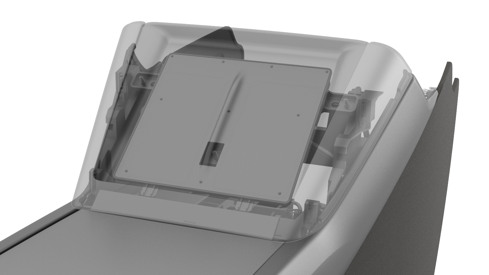 The phone dock, located at the front of the center console, has space for two phones and provides inductive charging. Along with phone charging, both sides of the phone dock contains the Near Field Communication (NFC) key card reader to start the vehicle with the keycard.