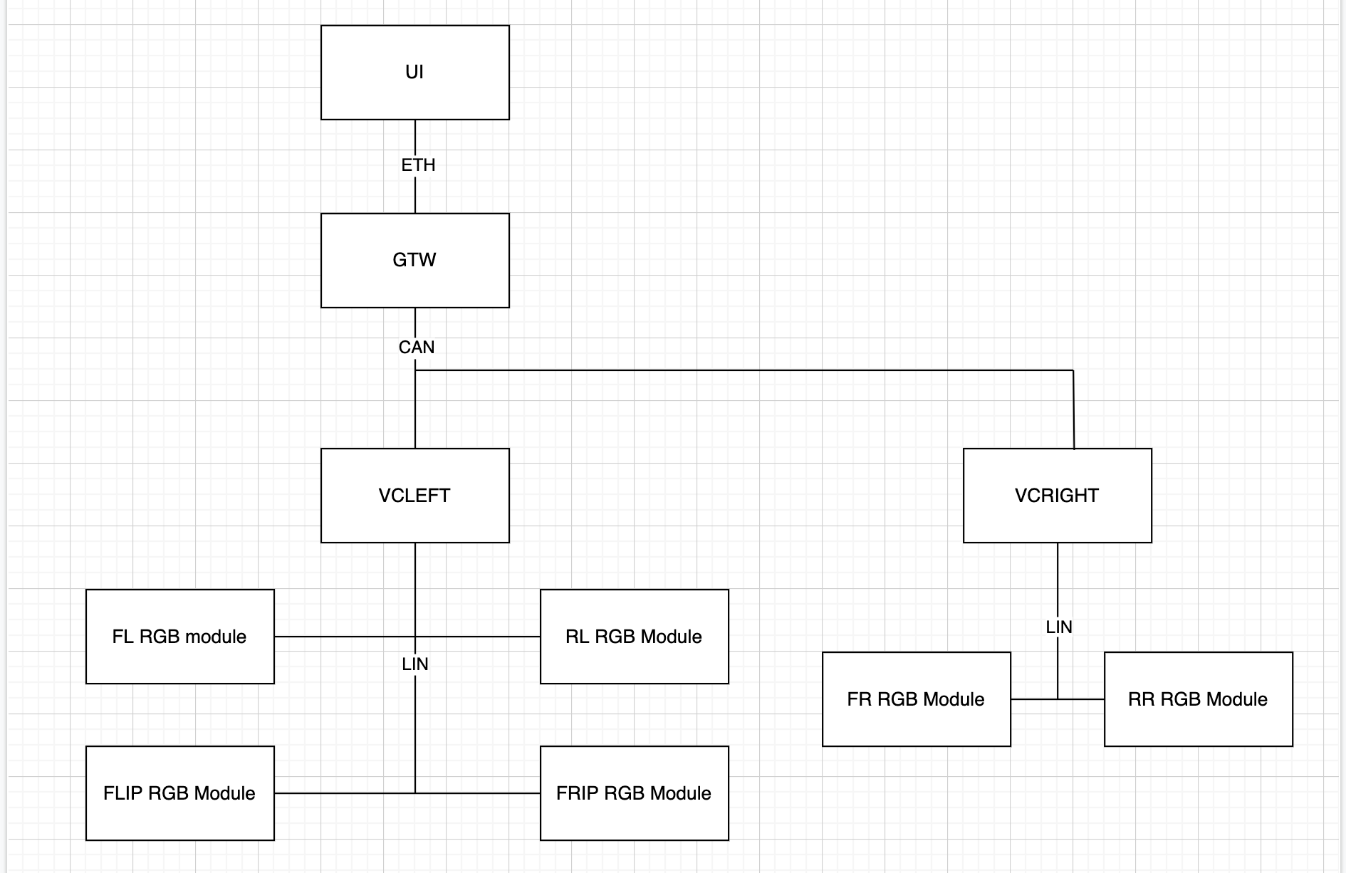 The UI displays various light color options to adjust the RBG lights under Controls > Lights > Accent Lights. The RGB lights are controlled by the left and right vehicle controllers via LIN. The UI communicates with left and right vehicle controllers over the CAN bus.