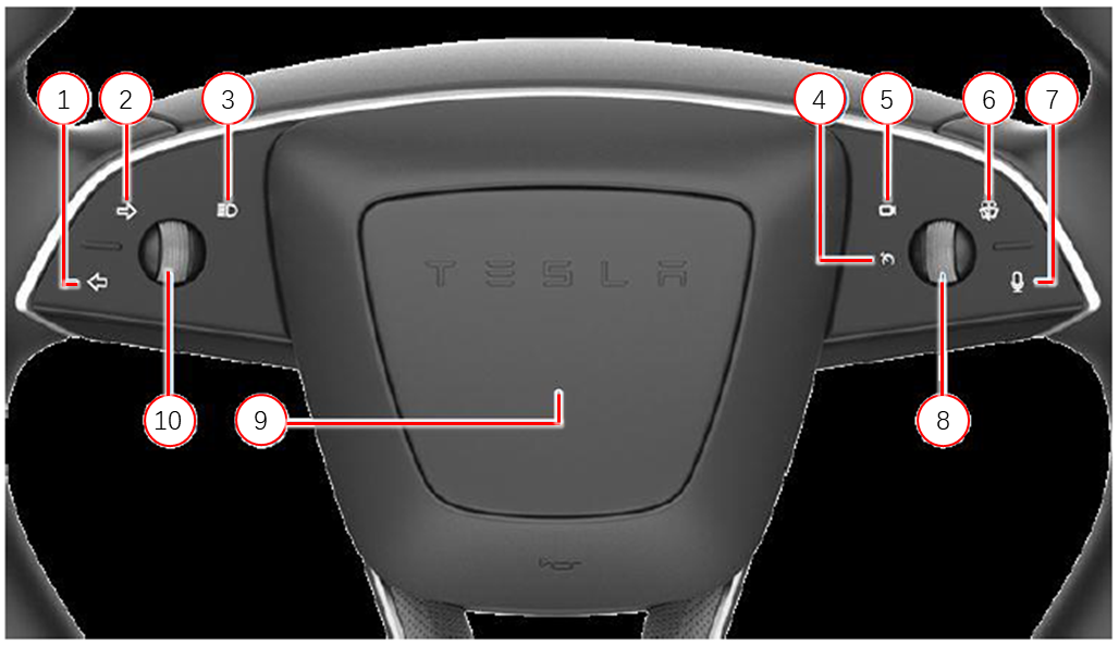 | 1. Left turn signal 2. Right turn signal 3. High beam 4. Cruise control (backlight only, the function is on the right scroll wheel) 5. Cameras 6. Wipers 7. Voice command 8. Right scroll wheel 9. Horn 10. Left scroll wheel |