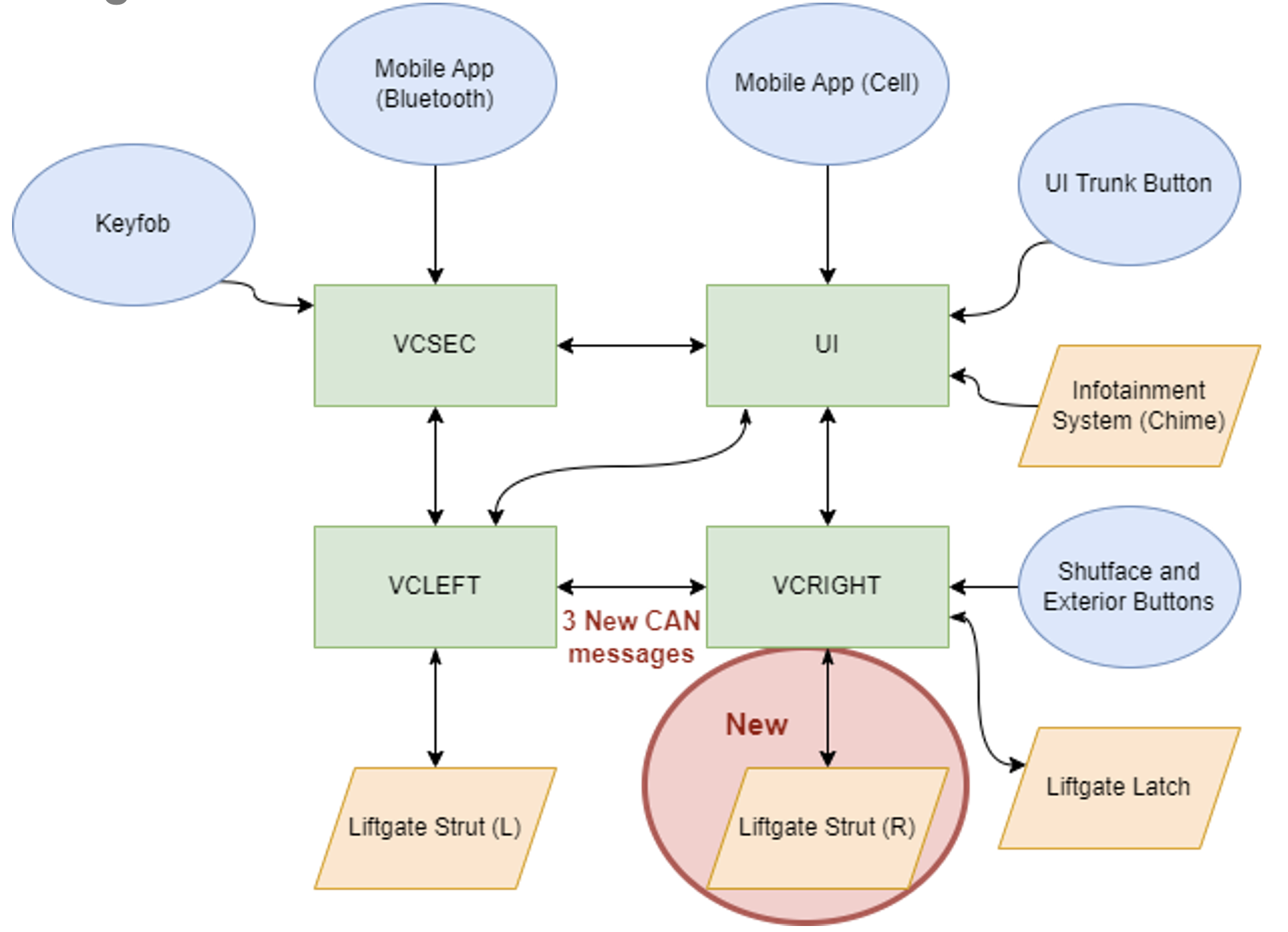 - The UI would send trunk request message on the vehicle controller area network (CAN), and VCLEFT or VCRIGHT would command power struts and latch to execute the desired action.