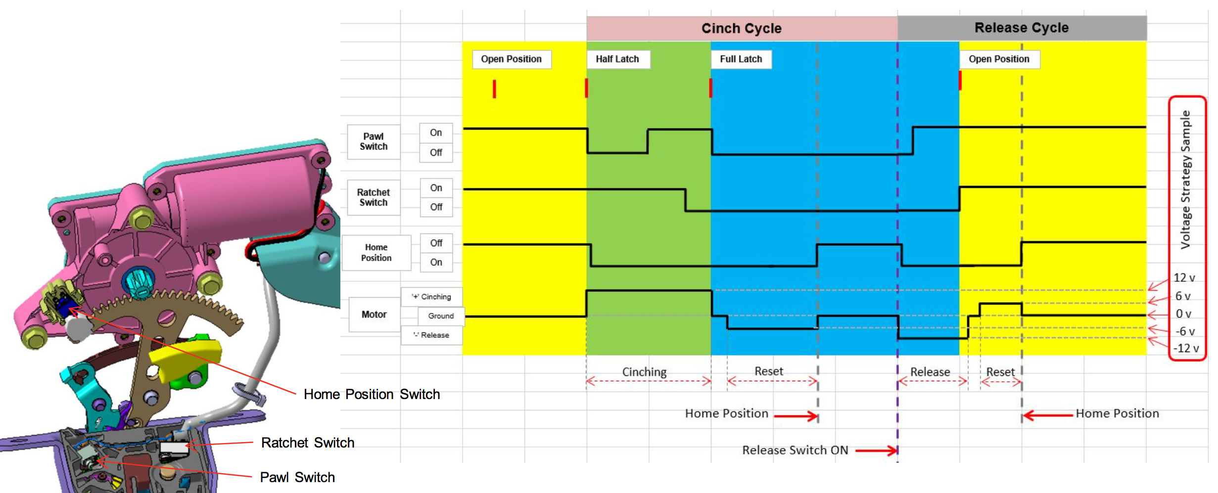 The below diagram describes the different switches as well as the motor states during a cinching actuation: