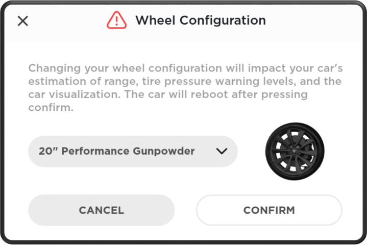 Vehicles running firmware versions earlier than 2019.32.X and have an incorrect wheel configuration should be updated to the latest firmware version, as this allows for easy wheel configuration change through the vehicle touchscreen.