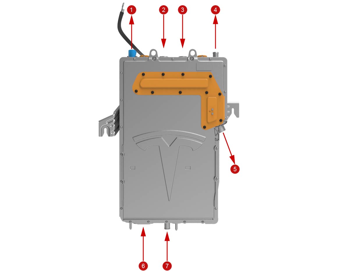 | 1. HV output to rear HVAC (blank in Model S) 2. HV Charge Port input (–) 3. HV Charge Port input (+) 4. Coolant outlet 5. HV output to Rapid Splitter 6. Coolant inlet 7. Low Voltage connections |