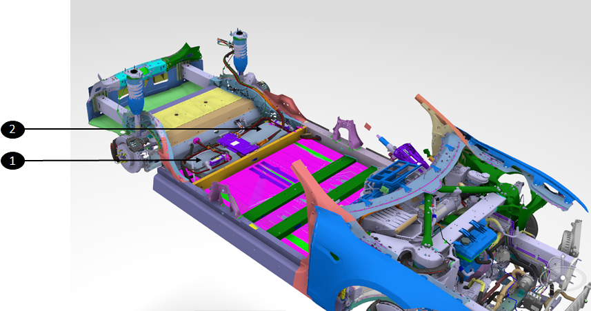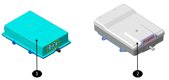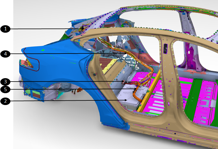 | 1. Charge Port 2. Charger 3. Rapid Splitter 4. HV cables between Charge Port and Charger (x2 in North America, x4 in EMEA/APAC) 5. HV cables between Rapid Splitter and Charger |