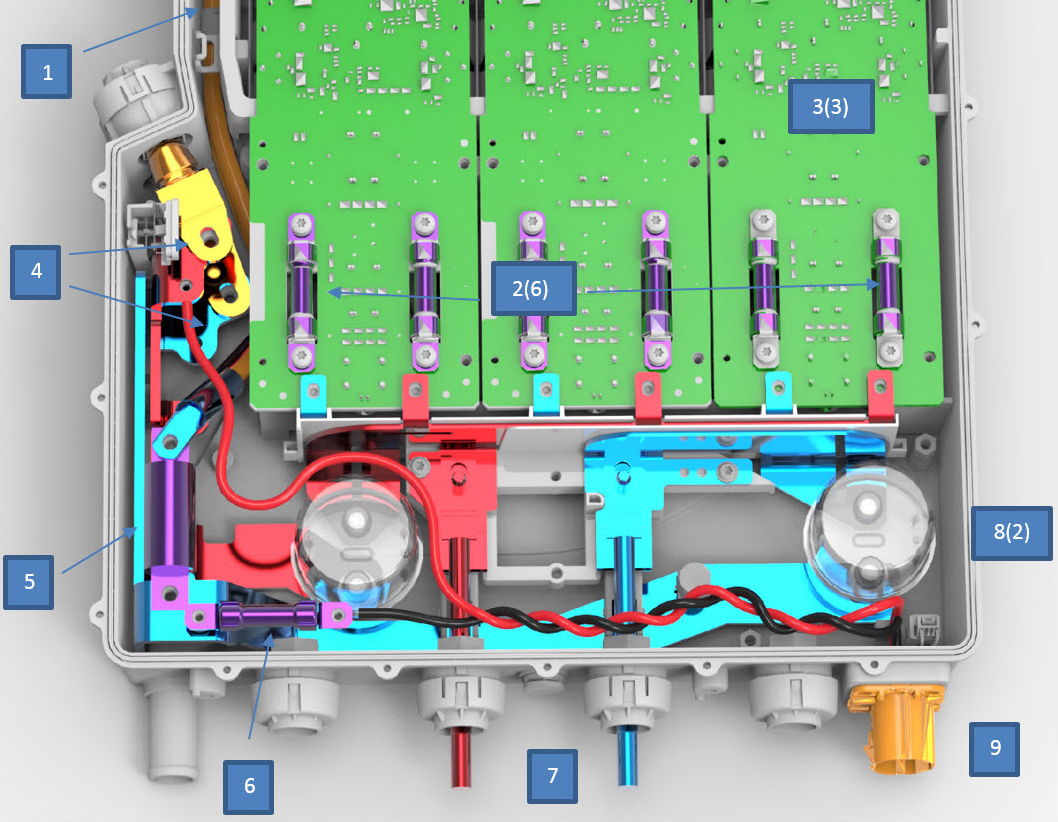 | 1. HV DC output from converter 2. Phase fuses (x6) 3. Phase boards (x3) 4. HV to Rapid Splitter lugs 5. Main Charger fuse 6. Rear PTC heater fuse 7. HV (AC or DC) from Charge Port 8. Fast Charge contactors (x2) 9. HV output to rear HVAC |