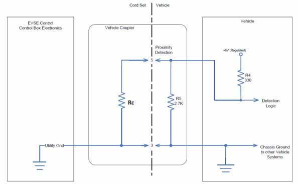 The Proximity circuit indicates that a charge cable is physically connected to the charge port. The purpose of proximity detection is to initiate the charging sequence, and to prevent movement of the vehicle while a cable is connected. The proximity circuit is shown on the diagram below: