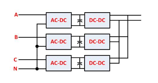 Although the phase boards are identical across the three-phase and single-phase versions of the charger, the routing of the incoming AC wires is different. The three-phase version connects each incoming phase to one phase board, and connects the neutral to all three-phase boards. The single-phase version connects all three-phase boards in parallel to phase and neutral. See the diagram below.
