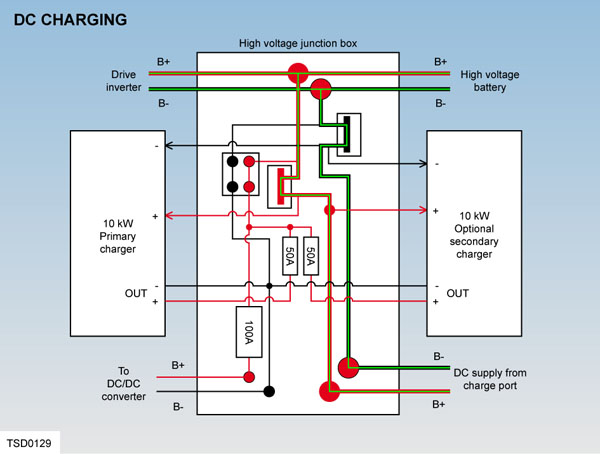 No current flows through the onboard charger(s) during DC charging. However, the master charger is still crucial to the process, as it controls the fast charge contactors inside the HV Junction Box.