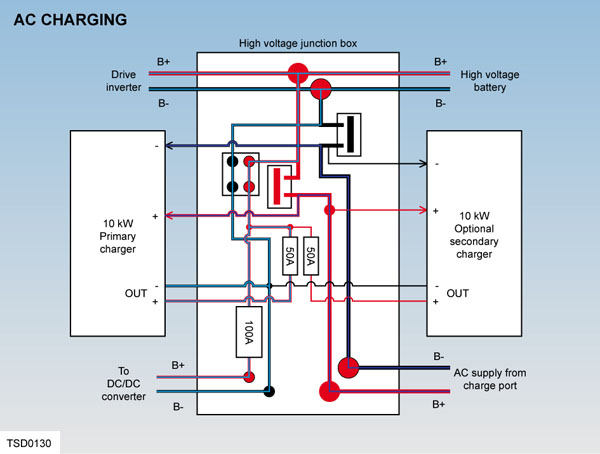 The vehicle recognizes when an AC charge source is connected using CAN communication with the Battery Management System (BMS). When charging from an alternating current (AC) source, current flows from the source through the connector to the charge port. From the charge port, it passes to the HVJB and is then routed by bus bars to the onboard charger(s). The chargers convert the AC to DC and supply current to the HV battery.