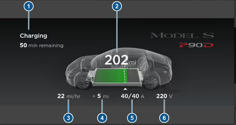 | 1. Charging status information 2. Total estimated driving distance (or energy) available. 3. Charging rate per hour 4. Range increase this charging session 5. Charging current/maximum current available from supply 6. Voltage of supply |