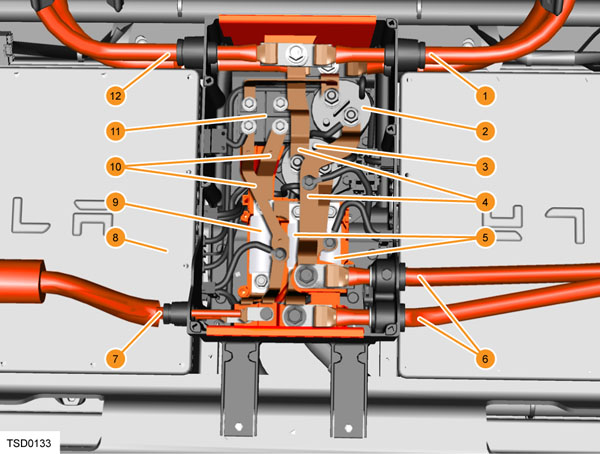 | 1. High voltage battery 2. B- contactor 3. B+ contactor 4. High current bus bars 5. 2 x 50 Amp fuses 6. Charge port 7. To DC/DC converter 8. 10 kW master charger 9. 100 Amp fuse 10. Low current bus bars 11. Noise filter 12. Drive inverter |