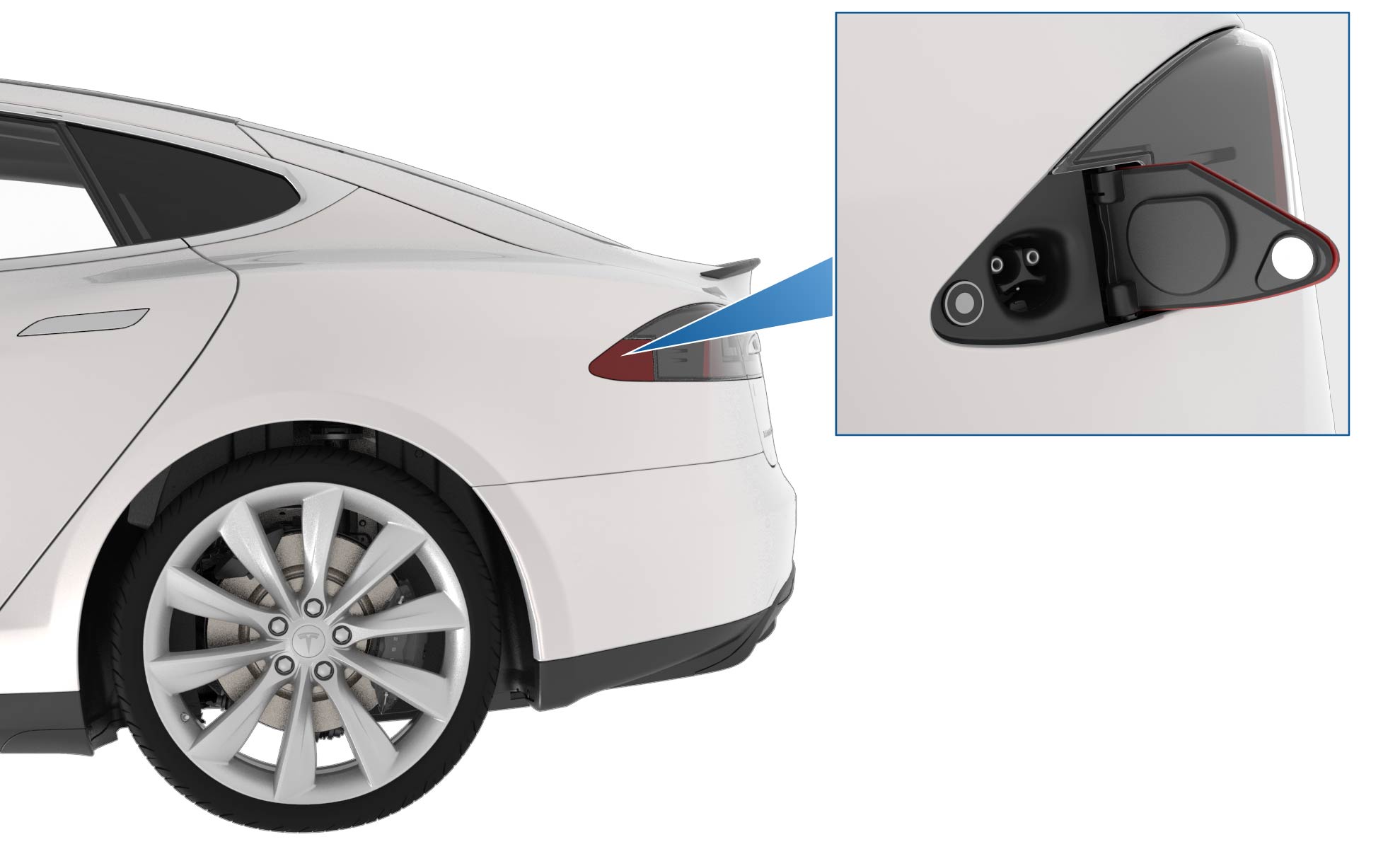 The charge port is located on the driver’s side behind a door which is part of the tail light assembly.