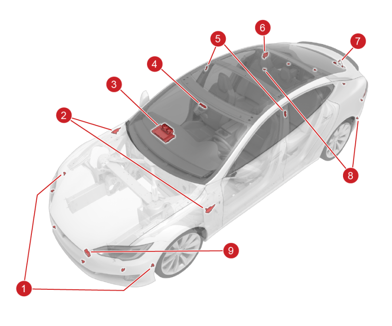 | 1. Front ultrasonic sensors (x6) 2. Side repeater cameras (x2) 3. Driver Assistance Electronic Control Unit (ECU) 4. Forward-facing camera assembly with 3 cameras 5. B-Pillar cameras (x2) 6. Park Assist ECU 7. Rear view camera 8. Rear ultrasonic sensors (x6) 9. Radar sensor |
