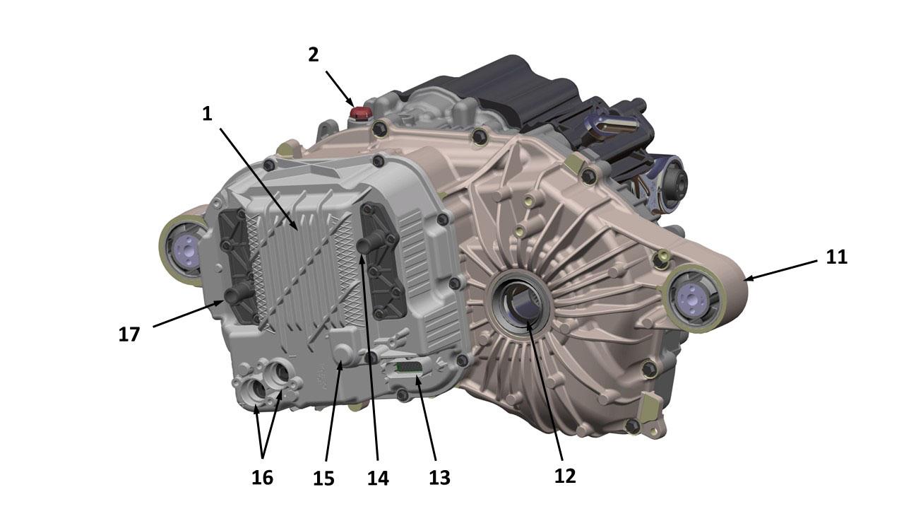 | 1. Drive inverter 2. Gearbox breather 3. Gearbox rear mounting 4. Motor 5. Side motor mount 6. Heat exchanger coolant outlet 7. Gearbox output LH 8. Gearbox fluid drain plug 9. Gearbox fluid fill plug 10. Heat exchanger coolant inlet 11. Gearbox front mounting 12. Gearbox output RH 13. Low voltage logic connector 14. Inverter coolant outlet 15. Inverter breather 16. High voltage connectors 17. Inverter coolant inlet |