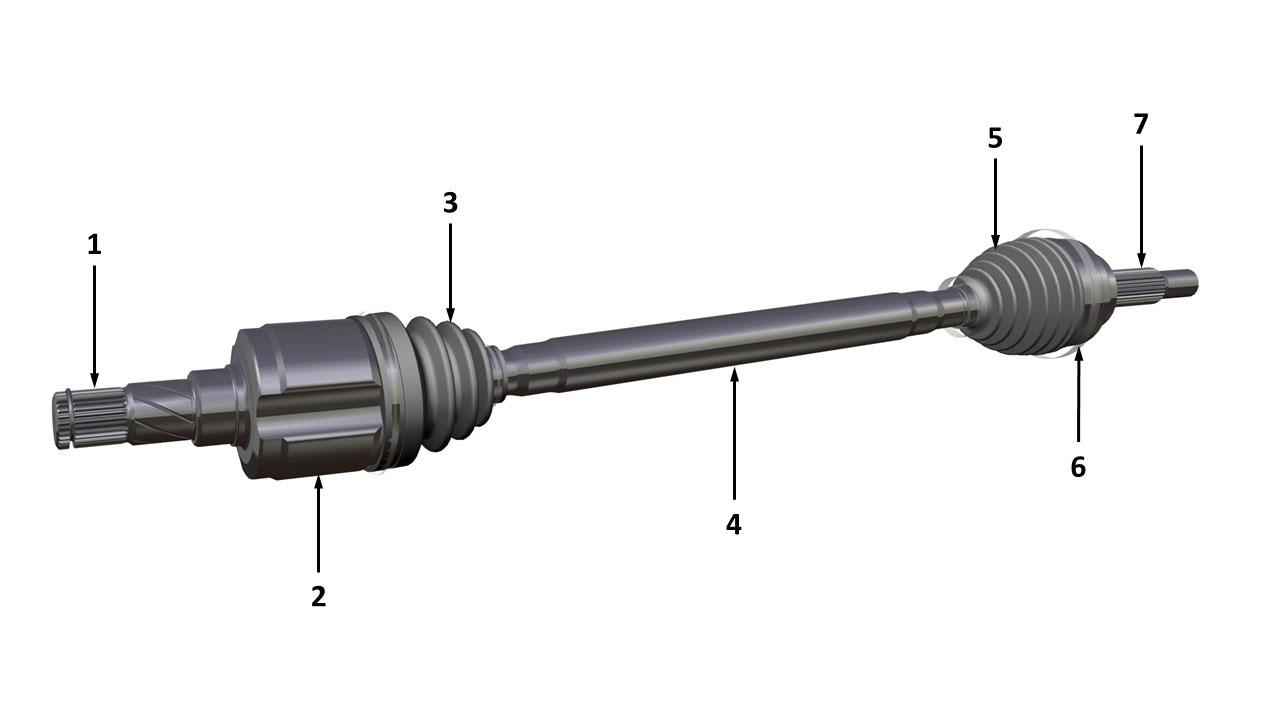 | 1. Differential spline 2. Inner CV joint 3. Inner CV joint boot 4. Driveshaft 5. Outer CV joint boot 6. Outer CV joint 7. Hub spline |