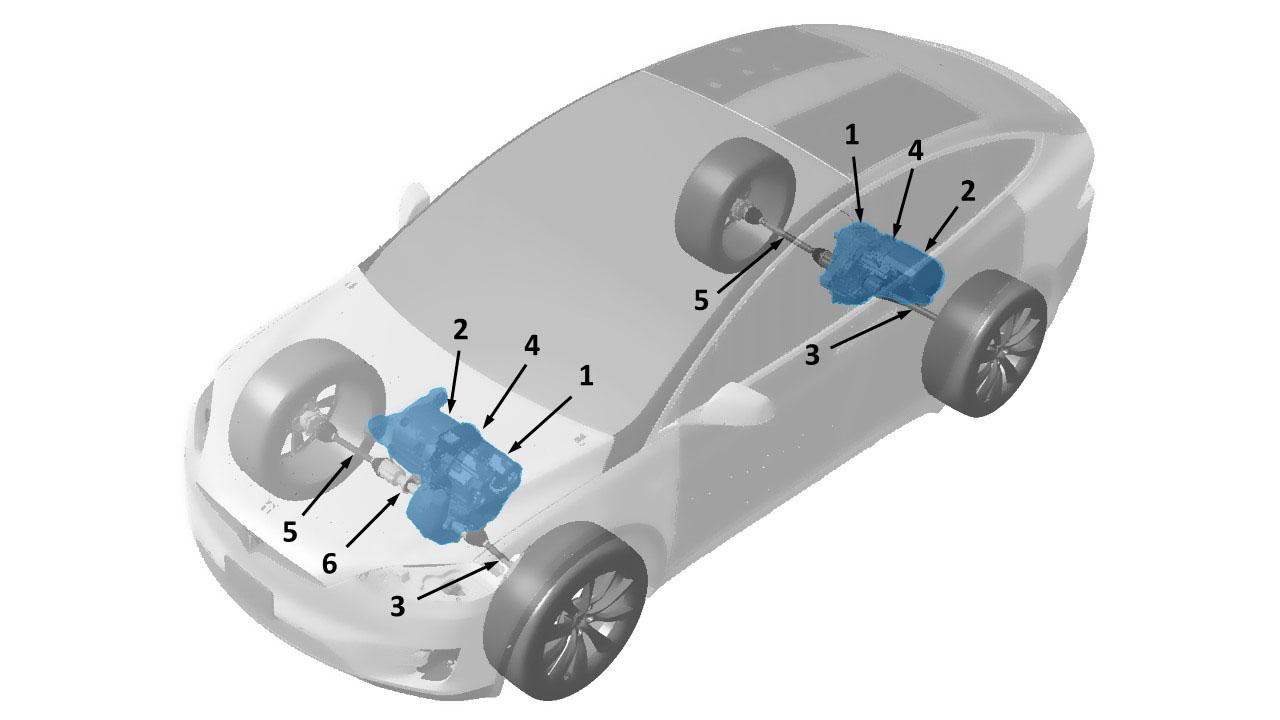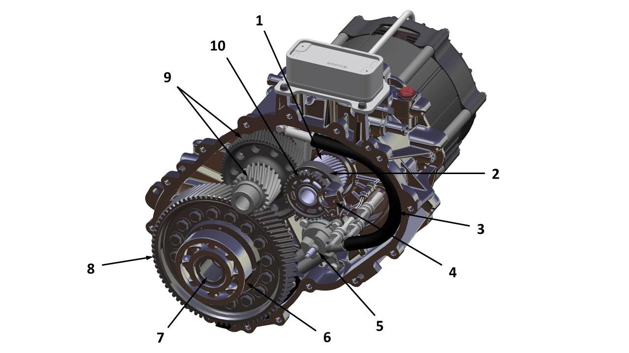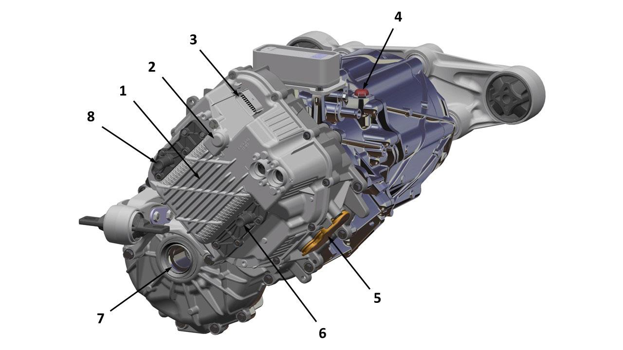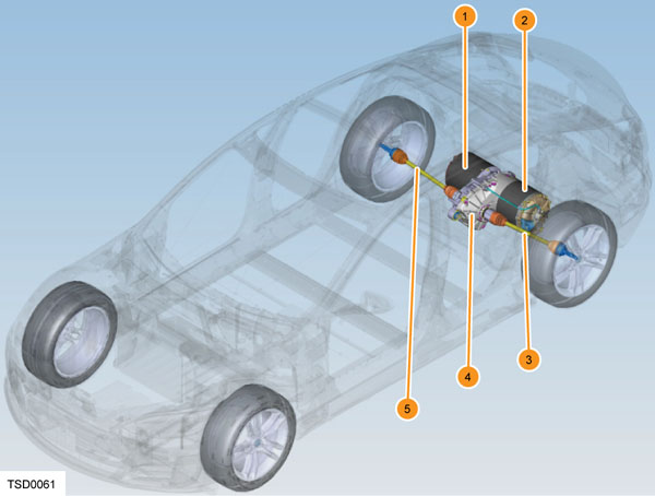 | 1. Drive inverter 2. Motor 3. Driveshaft LH 4. Gearbox 5. Driveshaft RH |